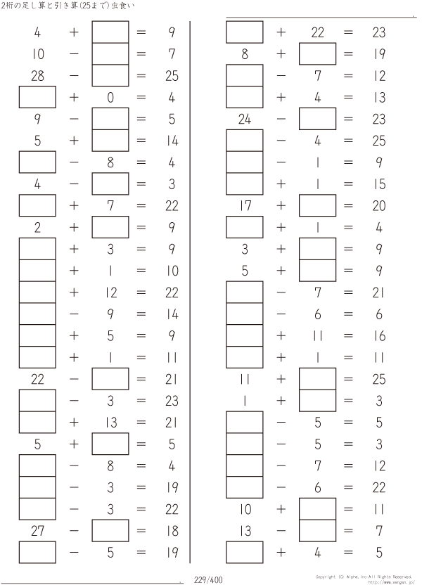 上記のボタンから「答えが25までの引き算と足し算」の算数数学ドリル・計算ドリル(PDFプリント)がダウンロードできます。個人利用は無料です(家庭以外での配布は有料です)。