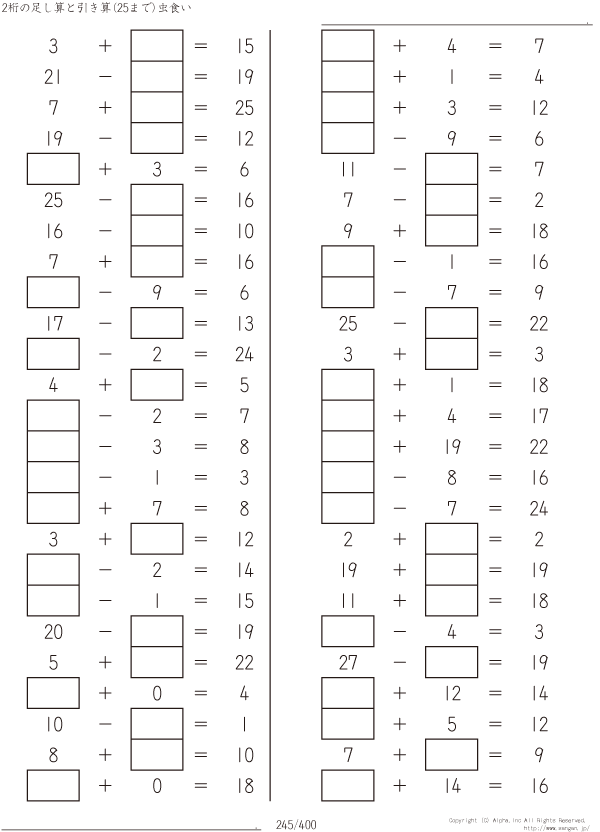 上記のボタンから「答えが25までの引き算と足し算」の算数数学ドリル・計算ドリル(PDFプリント)がダウンロードできます。個人利用は無料です(家庭以外での配布は有料です)。