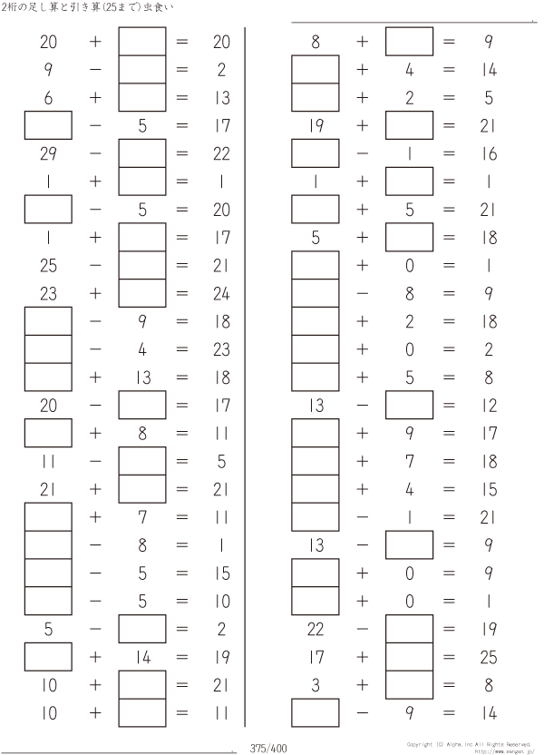 上記のボタンから「答えが25までの引き算と足し算」の算数数学ドリル・計算ドリル(PDFプリント)がダウンロードできます。個人利用は無料です(家庭以外での配布は有料です)。