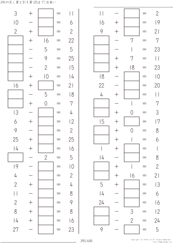 上記のボタンから「答えが25までの引き算と足し算」の算数数学ドリル・計算ドリル(PDFプリント)がダウンロードできます。個人利用は無料です(家庭以外での配布は有料です)。