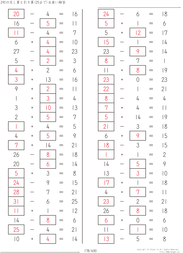 上記のボタンから「答えが25までの引き算と足し算」の算数数学ドリル・計算ドリル(PDFプリント)がダウンロードできます。個人利用は無料です(家庭以外での配布は有料です)。