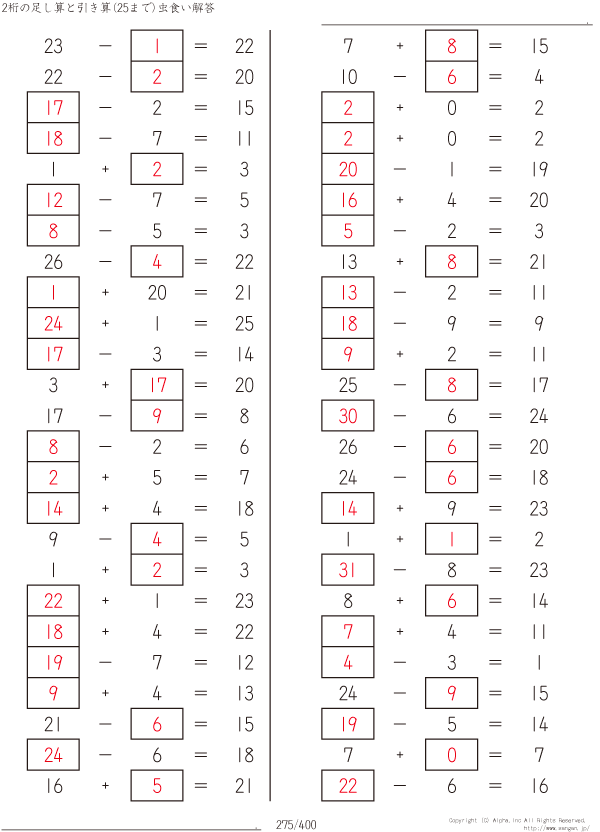 上記のボタンから「答えが25までの引き算と足し算」の算数数学ドリル・計算ドリル(PDFプリント)がダウンロードできます。個人利用は無料です(家庭以外での配布は有料です)。