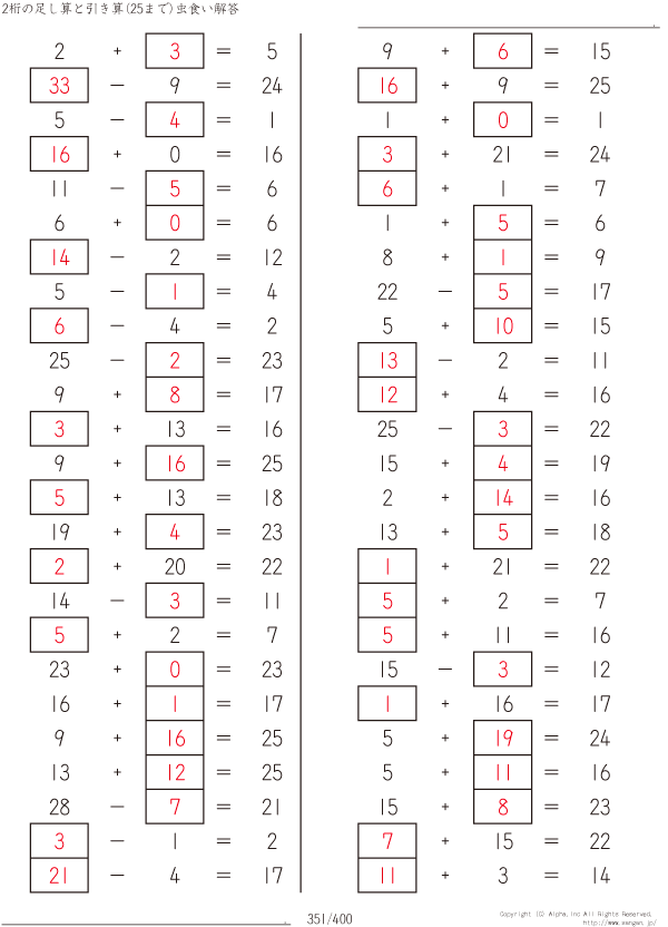 上記のボタンから「答えが25までの引き算と足し算」の算数数学ドリル・計算ドリル(PDFプリント)がダウンロードできます。個人利用は無料です(家庭以外での配布は有料です)。