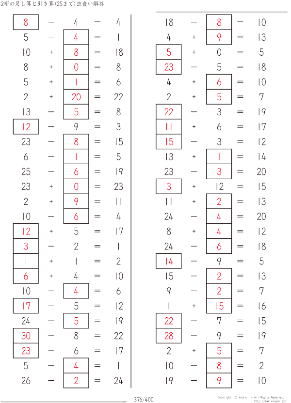 答えが25までの引き算と足し算 [解答]376/400