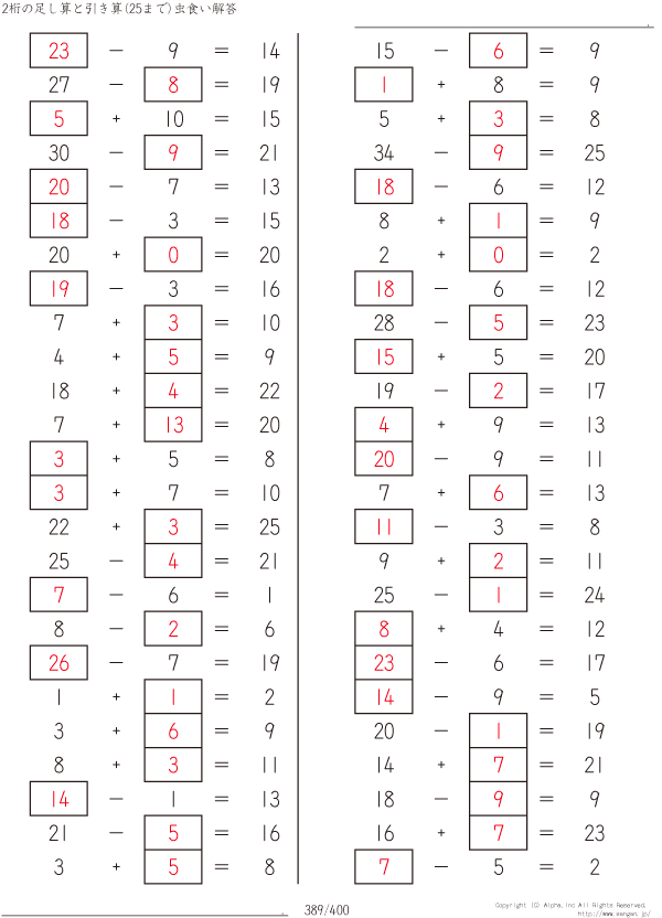 上記のボタンから「答えが25までの引き算と足し算」の算数数学ドリル・計算ドリル(PDFプリント)がダウンロードできます。個人利用は無料です(家庭以外での配布は有料です)。