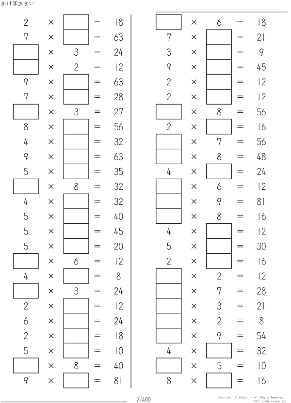上記のボタンから「虫食い・1桁の掛け算」の算数数学ドリル・計算ドリル(PDFプリント)がダウンロードできます。個人利用は無料です(家庭以外での配布は有料です)。