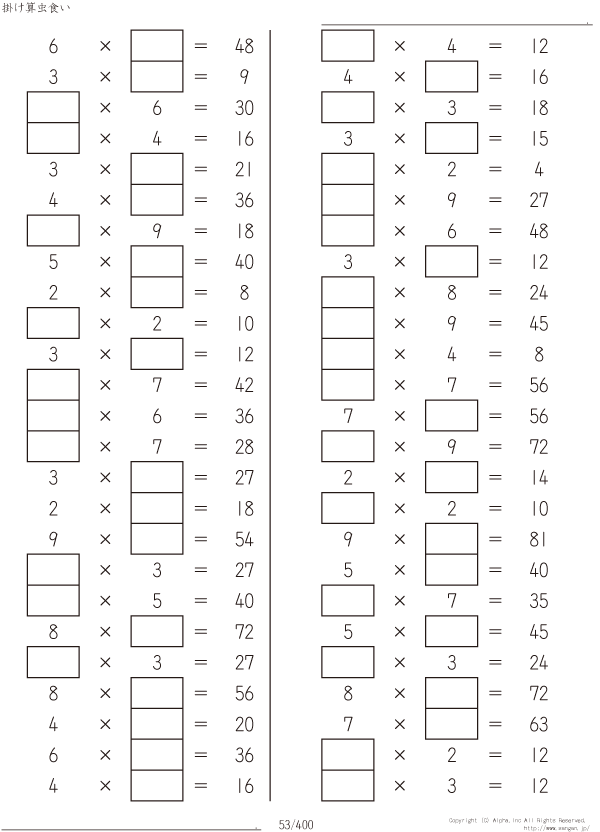 上記のボタンから「虫食い・1桁の掛け算」の算数数学ドリル・計算ドリル(PDFプリント)がダウンロードできます。個人利用は無料です(家庭以外での配布は有料です)。