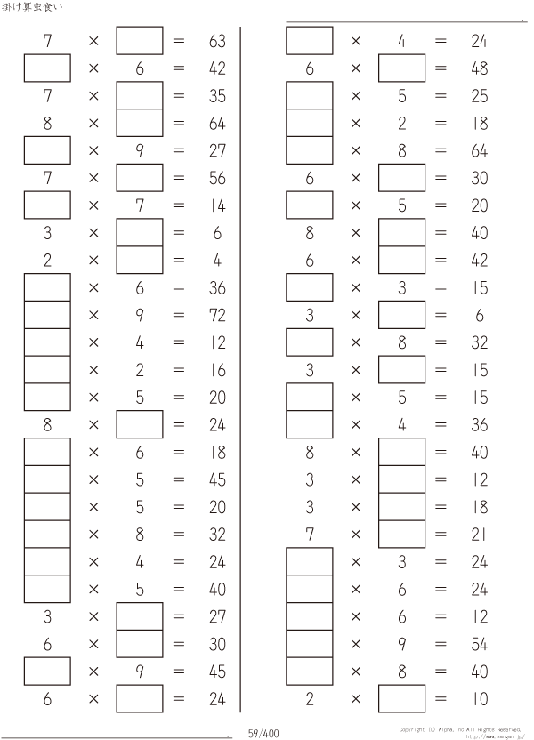 上記のボタンから「虫食い・1桁の掛け算」の算数数学ドリル・計算ドリル(PDFプリント)がダウンロードできます。個人利用は無料です(家庭以外での配布は有料です)。