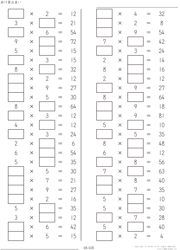 上記のボタンから「虫食い・1桁の掛け算」の算数数学ドリル・計算ドリル(PDFプリント)がダウンロードできます。個人利用は無料です(家庭以外での配布は有料です)。