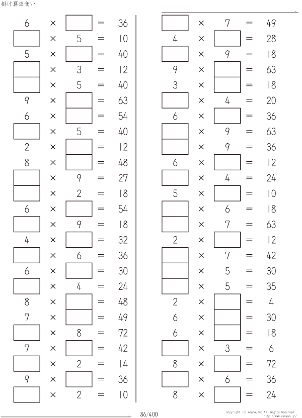 上記のボタンから「虫食い・1桁の掛け算」の算数数学ドリル・計算ドリル(PDFプリント)がダウンロードできます。個人利用は無料です(家庭以外での配布は有料です)。