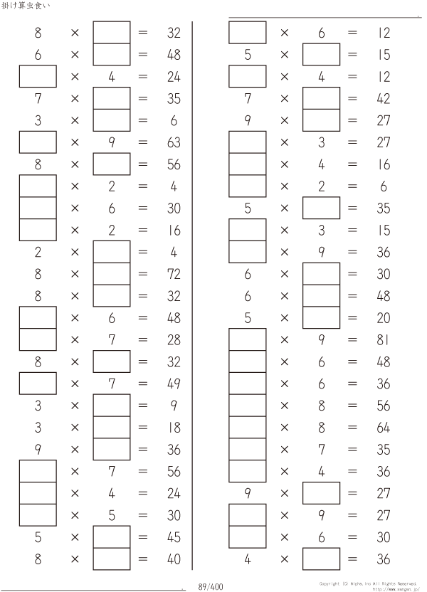 上記のボタンから「虫食い・1桁の掛け算」の算数数学ドリル・計算ドリル(PDFプリント)がダウンロードできます。個人利用は無料です(家庭以外での配布は有料です)。