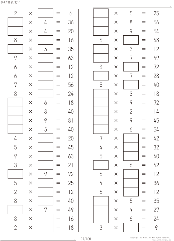 上記のボタンから「虫食い・1桁の掛け算」の算数数学ドリル・計算ドリル(PDFプリント)がダウンロードできます。個人利用は無料です(家庭以外での配布は有料です)。