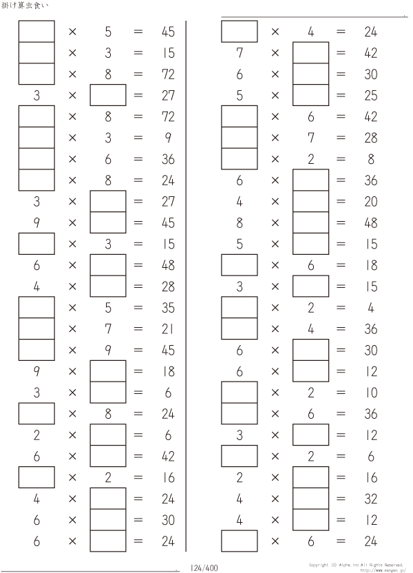上記のボタンから「虫食い・1桁の掛け算」の算数数学ドリル・計算ドリル(PDFプリント)がダウンロードできます。個人利用は無料です(家庭以外での配布は有料です)。
