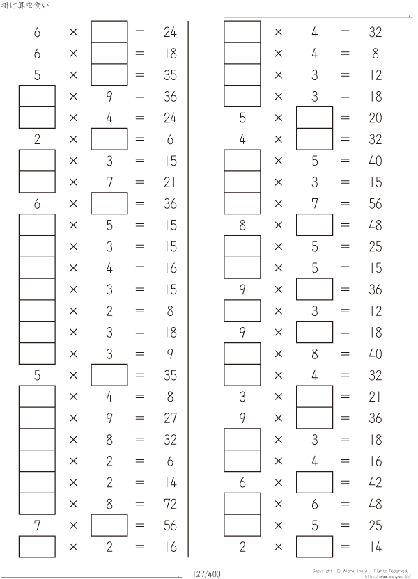 上記のボタンから「虫食い・1桁の掛け算」の算数数学ドリル・計算ドリル(PDFプリント)がダウンロードできます。個人利用は無料です(家庭以外での配布は有料です)。