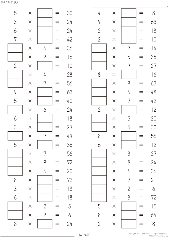 上記のボタンから「虫食い・1桁の掛け算」の算数数学ドリル・計算ドリル(PDFプリント)がダウンロードできます。個人利用は無料です(家庭以外での配布は有料です)。