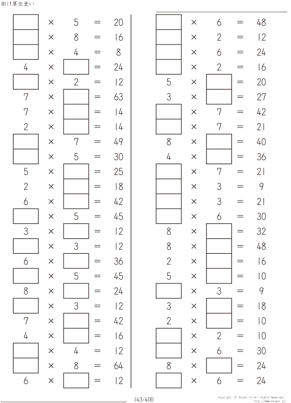 上記のボタンから「虫食い・1桁の掛け算」の算数数学ドリル・計算ドリル(PDFプリント)がダウンロードできます。個人利用は無料です(家庭以外での配布は有料です)。