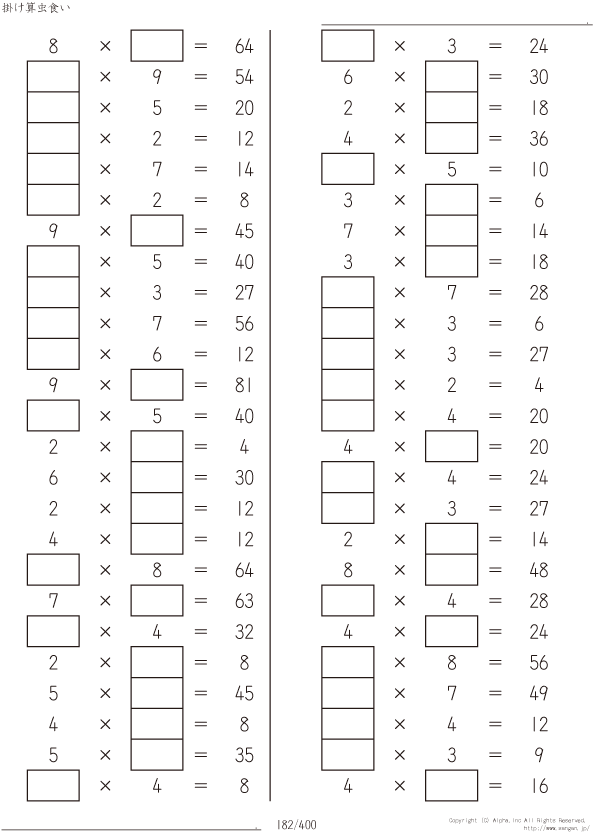 上記のボタンから「虫食い・1桁の掛け算」の算数数学ドリル・計算ドリル(PDFプリント)がダウンロードできます。個人利用は無料です(家庭以外での配布は有料です)。