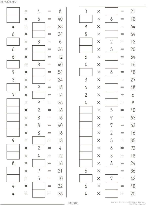 上記のボタンから「虫食い・1桁の掛け算」の算数数学ドリル・計算ドリル(PDFプリント)がダウンロードできます。個人利用は無料です(家庭以外での配布は有料です)。