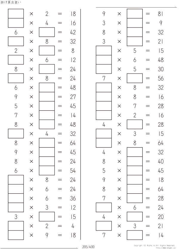 上記のボタンから「虫食い・1桁の掛け算」の算数数学ドリル・計算ドリル(PDFプリント)がダウンロードできます。個人利用は無料です(家庭以外での配布は有料です)。