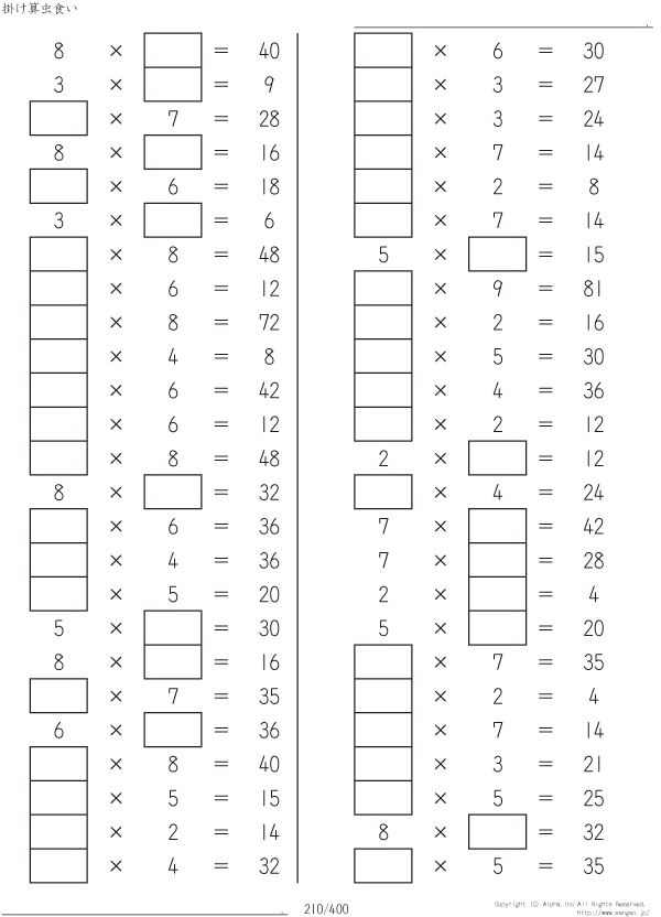 上記のボタンから「虫食い・1桁の掛け算」の算数数学ドリル・計算ドリル(PDFプリント)がダウンロードできます。個人利用は無料です(家庭以外での配布は有料です)。