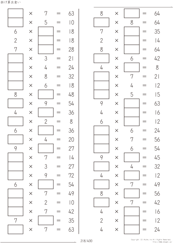 上記のボタンから「虫食い・1桁の掛け算」の算数数学ドリル・計算ドリル(PDFプリント)がダウンロードできます。個人利用は無料です(家庭以外での配布は有料です)。