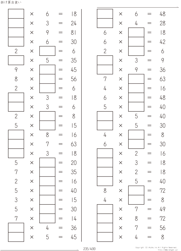 上記のボタンから「虫食い・1桁の掛け算」の算数数学ドリル・計算ドリル(PDFプリント)がダウンロードできます。個人利用は無料です(家庭以外での配布は有料です)。