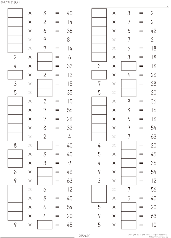 上記のボタンから「虫食い・1桁の掛け算」の算数数学ドリル・計算ドリル(PDFプリント)がダウンロードできます。個人利用は無料です(家庭以外での配布は有料です)。