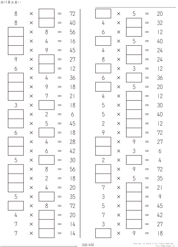 上記のボタンから「虫食い・1桁の掛け算」の算数数学ドリル・計算ドリル(PDFプリント)がダウンロードできます。個人利用は無料です(家庭以外での配布は有料です)。