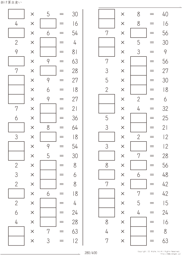 上記のボタンから「虫食い・1桁の掛け算」の算数数学ドリル・計算ドリル(PDFプリント)がダウンロードできます。個人利用は無料です(家庭以外での配布は有料です)。