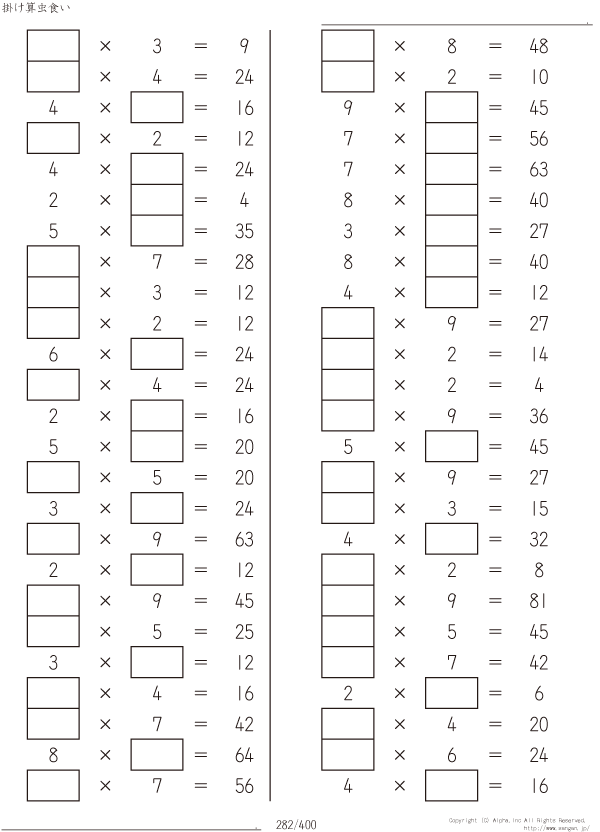上記のボタンから「虫食い・1桁の掛け算」の算数数学ドリル・計算ドリル(PDFプリント)がダウンロードできます。個人利用は無料です(家庭以外での配布は有料です)。