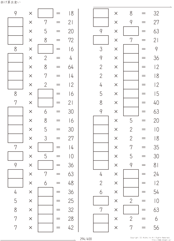 上記のボタンから「虫食い・1桁の掛け算」の算数数学ドリル・計算ドリル(PDFプリント)がダウンロードできます。個人利用は無料です(家庭以外での配布は有料です)。