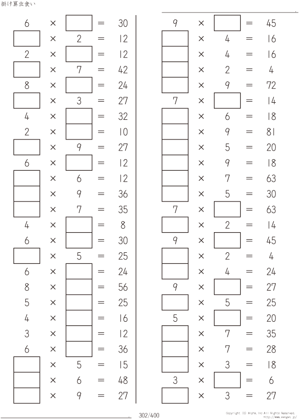 上記のボタンから「虫食い・1桁の掛け算」の算数数学ドリル・計算ドリル(PDFプリント)がダウンロードできます。個人利用は無料です(家庭以外での配布は有料です)。