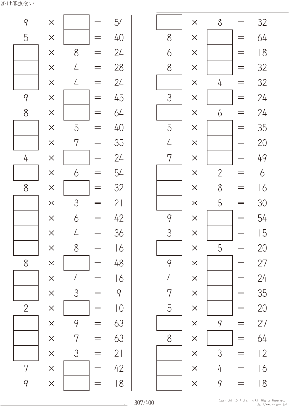上記のボタンから「虫食い・1桁の掛け算」の算数数学ドリル・計算ドリル(PDFプリント)がダウンロードできます。個人利用は無料です(家庭以外での配布は有料です)。