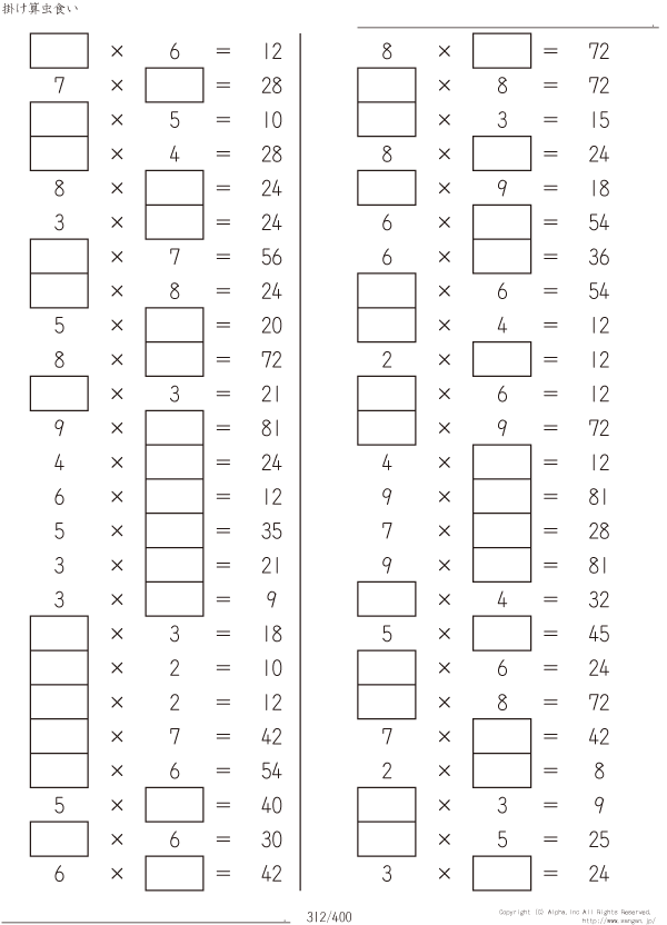 上記のボタンから「虫食い・1桁の掛け算」の算数数学ドリル・計算ドリル(PDFプリント)がダウンロードできます。個人利用は無料です(家庭以外での配布は有料です)。