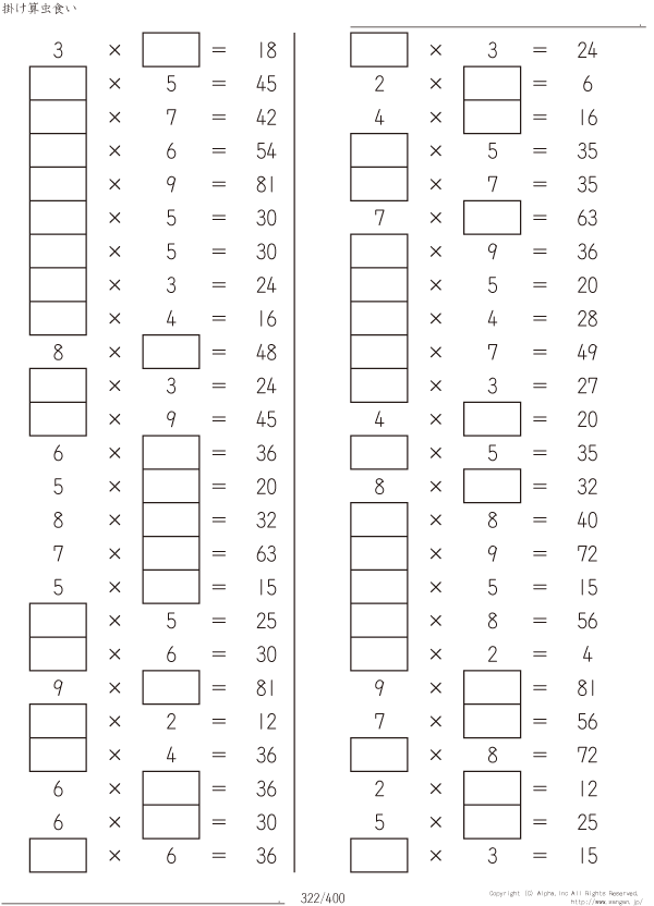 上記のボタンから「虫食い・1桁の掛け算」の算数数学ドリル・計算ドリル(PDFプリント)がダウンロードできます。個人利用は無料です(家庭以外での配布は有料です)。