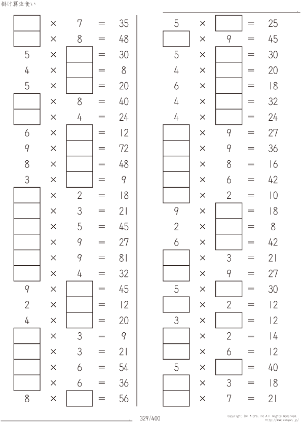 上記のボタンから「虫食い・1桁の掛け算」の算数数学ドリル・計算ドリル(PDFプリント)がダウンロードできます。個人利用は無料です(家庭以外での配布は有料です)。