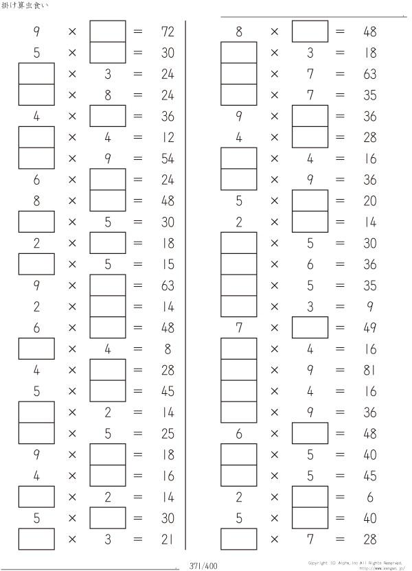上記のボタンから「虫食い・1桁の掛け算」の算数数学ドリル・計算ドリル(PDFプリント)がダウンロードできます。個人利用は無料です(家庭以外での配布は有料です)。