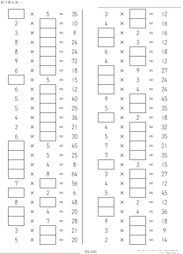 上記のボタンから「虫食い・1桁の掛け算」の算数数学ドリル・計算ドリル(PDFプリント)がダウンロードできます。個人利用は無料です(家庭以外での配布は有料です)。