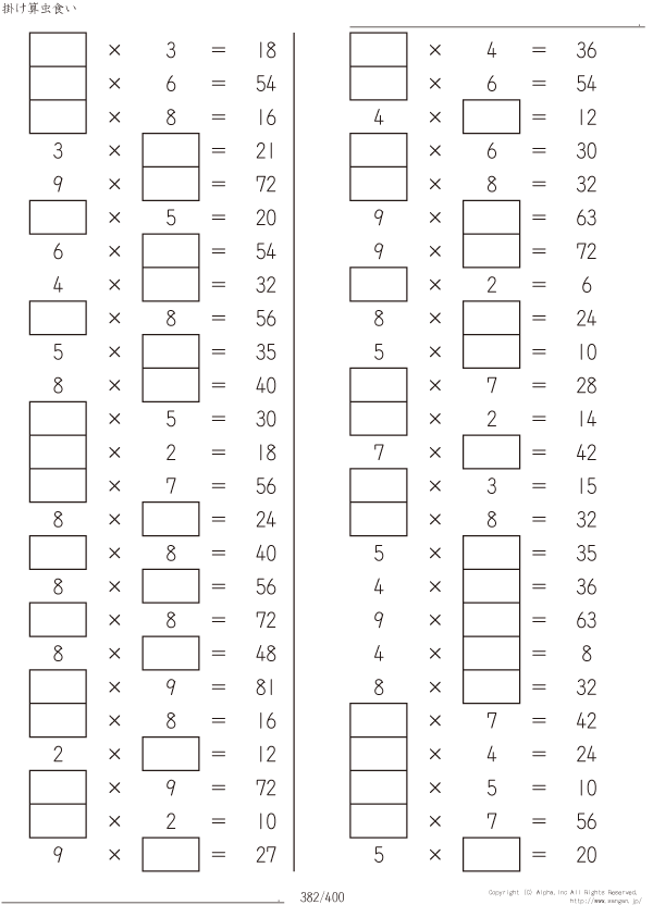 上記のボタンから「虫食い・1桁の掛け算」の算数数学ドリル・計算ドリル(PDFプリント)がダウンロードできます。個人利用は無料です(家庭以外での配布は有料です)。