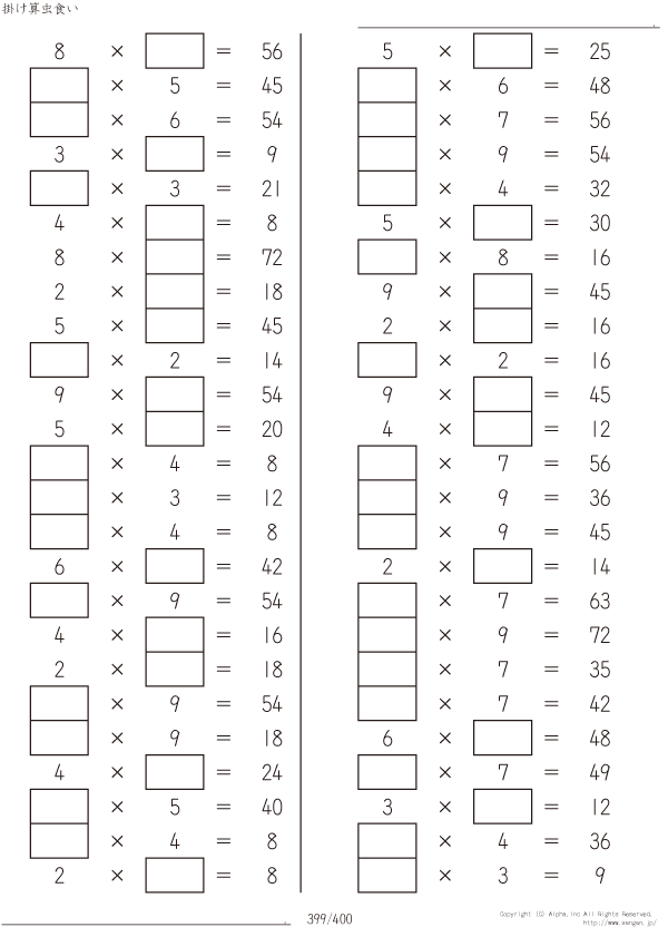 上記のボタンから「虫食い・1桁の掛け算」の算数数学ドリル・計算ドリル(PDFプリント)がダウンロードできます。個人利用は無料です(家庭以外での配布は有料です)。
