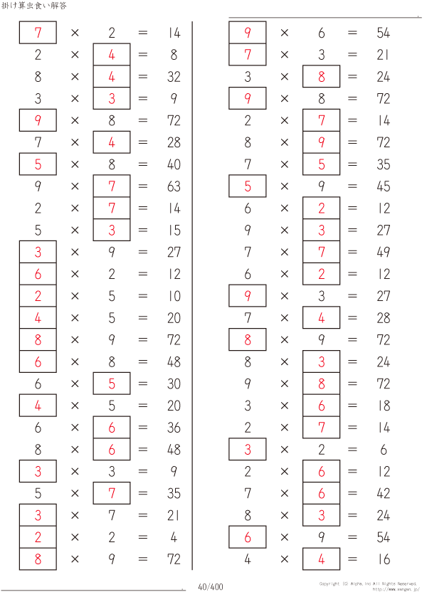 上記のボタンから「虫食い・1桁の掛け算」の算数数学ドリル・計算ドリル(PDFプリント)がダウンロードできます。個人利用は無料です(家庭以外での配布は有料です)。