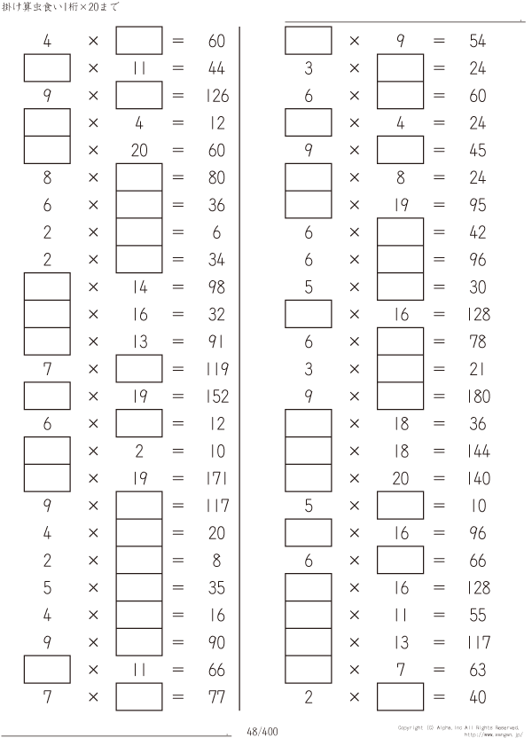 1桁かける20までの掛け算 [問題]048/400