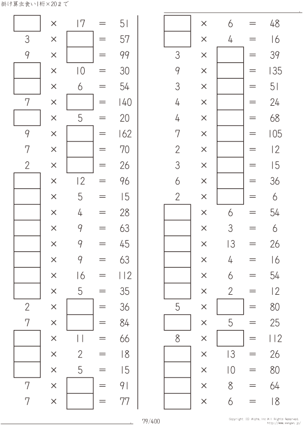 上記のボタンから「1桁かける20までの掛け算」の算数数学ドリル・計算ドリル(PDFプリント)がダウンロードできます。個人利用は無料です(家庭以外での配布は有料です)。
