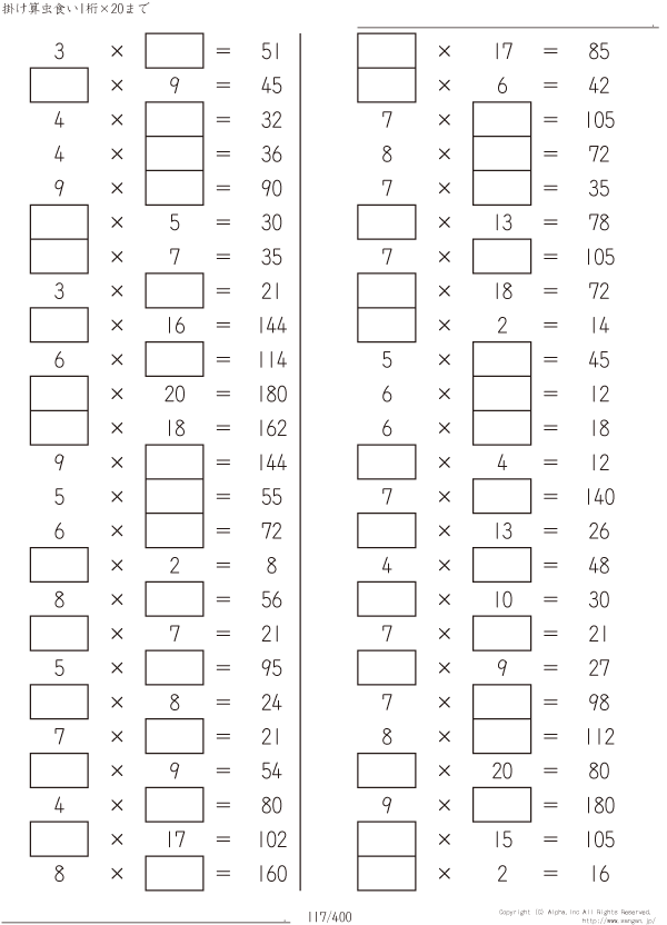 上記のボタンから「1桁かける20までの掛け算」の算数数学ドリル・計算ドリル(PDFプリント)がダウンロードできます。個人利用は無料です(家庭以外での配布は有料です)。