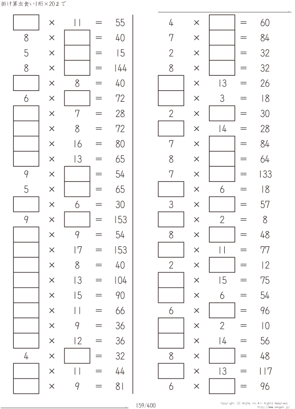 上記のボタンから「1桁かける20までの掛け算」の算数数学ドリル・計算ドリル(PDFプリント)がダウンロードできます。個人利用は無料です(家庭以外での配布は有料です)。