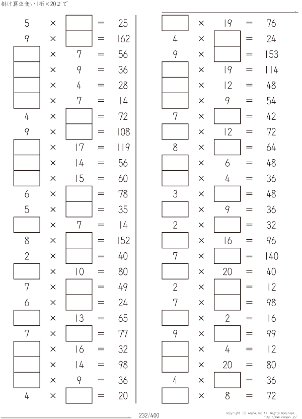 上記のボタンから「1桁かける20までの掛け算」の算数数学ドリル・計算ドリル(PDFプリント)がダウンロードできます。個人利用は無料です(家庭以外での配布は有料です)。