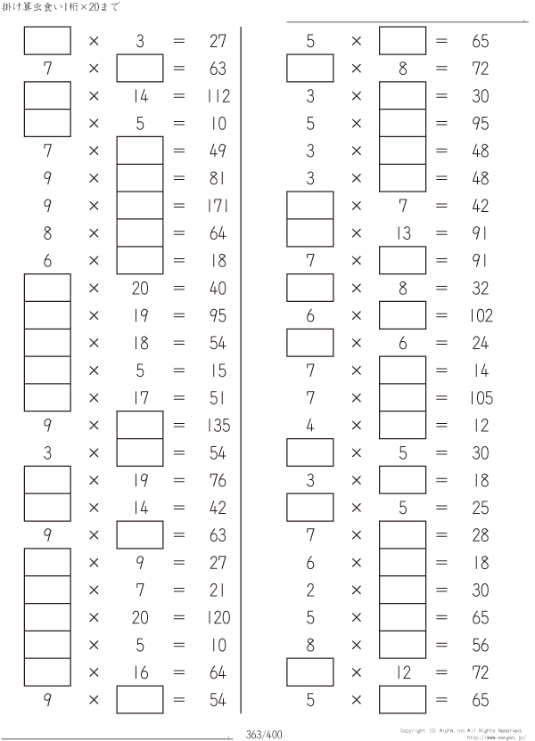 上記のボタンから「1桁かける20までの掛け算」の算数数学ドリル・計算ドリル(PDFプリント)がダウンロードできます。個人利用は無料です(家庭以外での配布は有料です)。