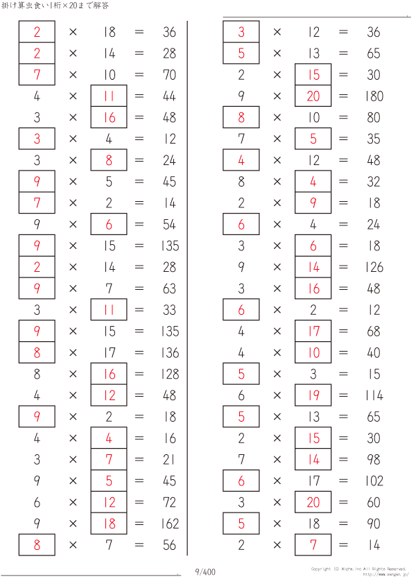 上記のボタンから「1桁かける20までの掛け算」の算数数学ドリル・計算ドリル(PDFプリント)がダウンロードできます。個人利用は無料です(家庭以外での配布は有料です)。