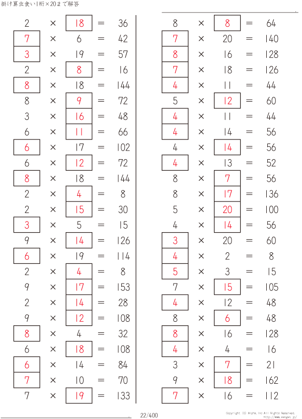 上記のボタンから「1桁かける20までの掛け算」の算数数学ドリル・計算ドリル(PDFプリント)がダウンロードできます。個人利用は無料です(家庭以外での配布は有料です)。