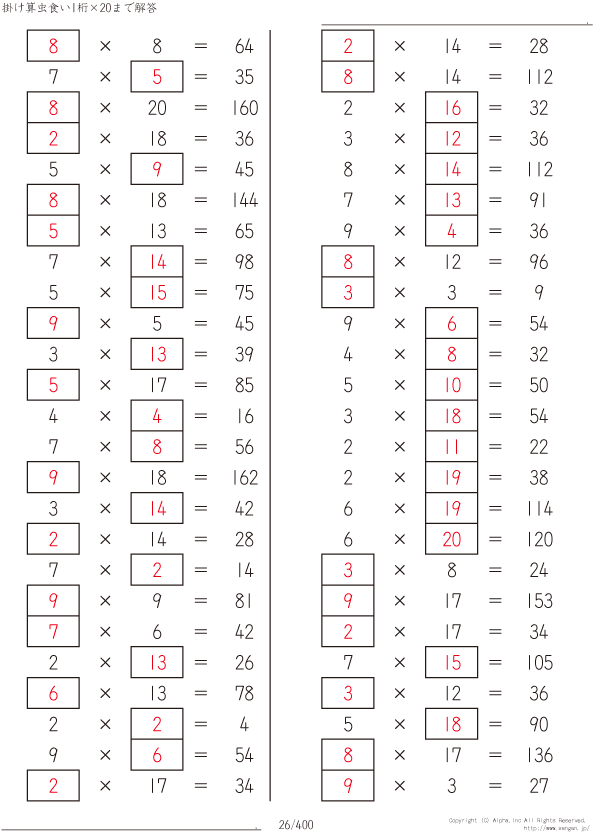 上記のボタンから「1桁かける20までの掛け算」の算数数学ドリル・計算ドリル(PDFプリント)がダウンロードできます。個人利用は無料です(家庭以外での配布は有料です)。
